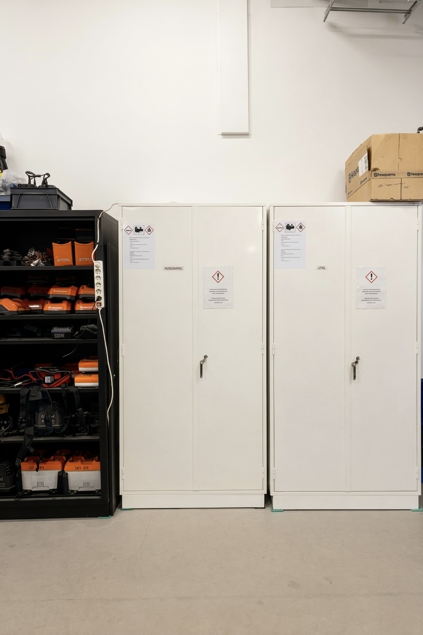 JiWa Batteriskåp är brandisolerade och är brandtestade för yttre brand enligt SP metod 2369. Skåpen levereras med 2st brandvarnare som aktiveras vid rök, kraftig temperaturökning samt när temperaturen i skåpet överstiger 54°C. Det yttre larmet levereras löst i skåpet för valfri placering, det inre är monterat på skåpets innertak. Indragen el och ett grenuttag. Perforerade hyllor/hylla ingår. Hyllorna klarar 50 kg jämn belastning. Skåpen ventileras genom takets stos som är försett med en brandventil under. Ventilationen ska alltid vara påkopplad.