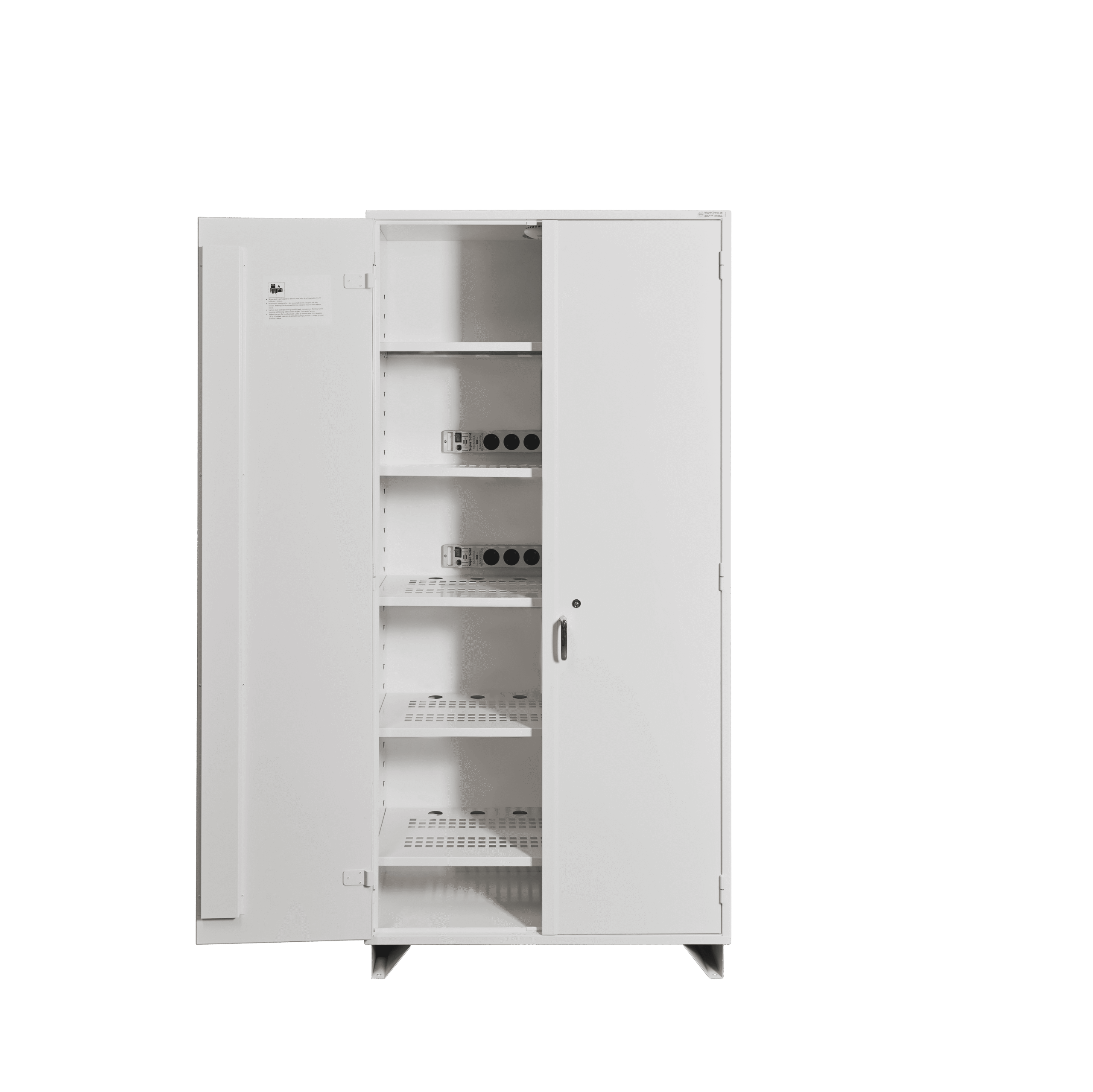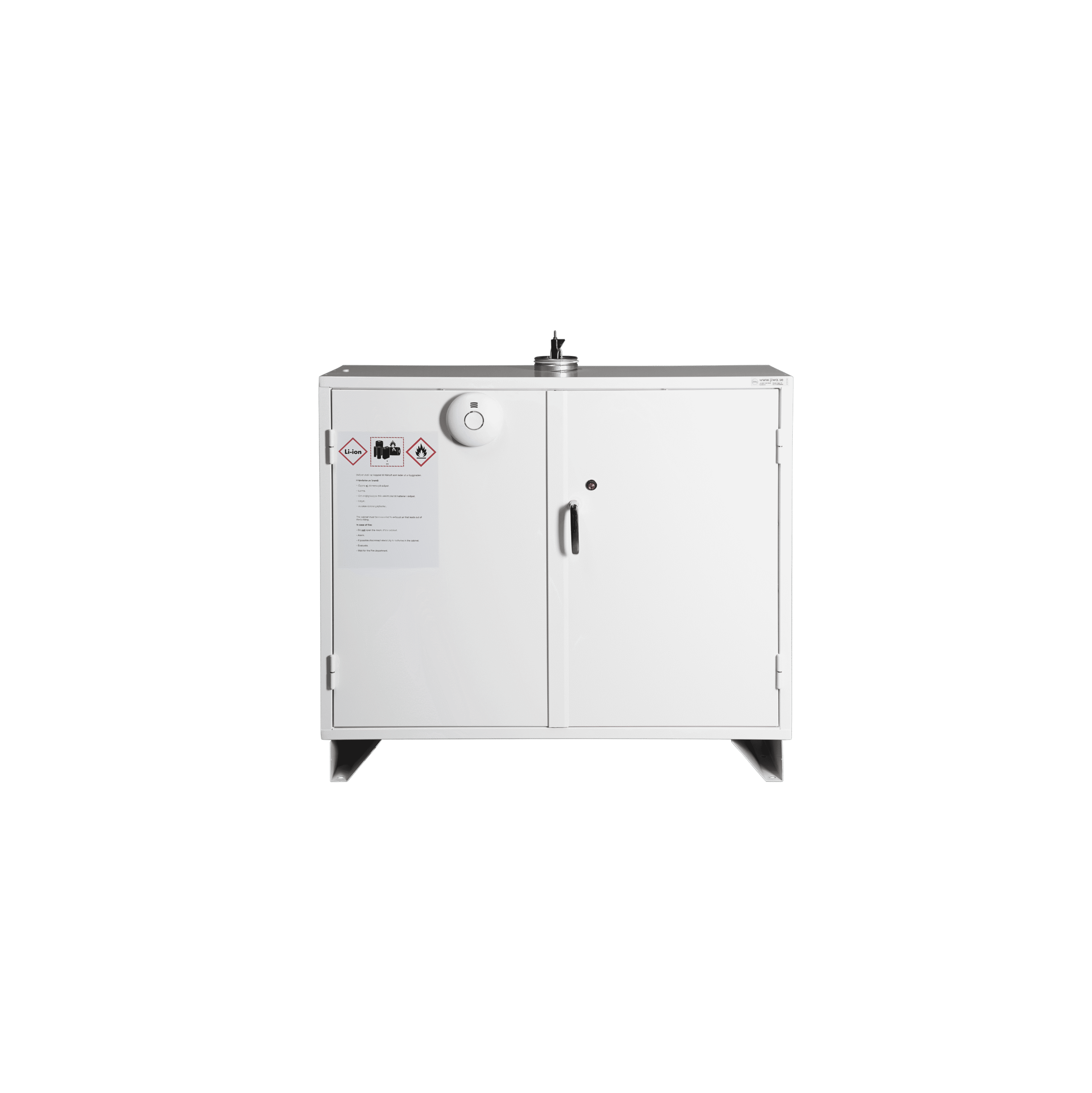 JiWa battery cabinets are fire-insulated and fire-tested for external fire according to SP method 2369. The cabinets are supplied with two smoke detectors that are activated by smoke, a rapid temperature increase, and when the internal cabinet temperature exceeds 54°C. The external alarm is supplied loose inside the cabinet for optional placement, while the internal alarm is mounted on the inside ceiling of the cabinet. Pre-installed electrical wiring and a power strip are included. Perforated shelf/shelves are included; the shelves support 50 kg of evenly distributed load. The cabinets are ventilated through the roof fitted with a fire damper. Ventilation must always be connected.