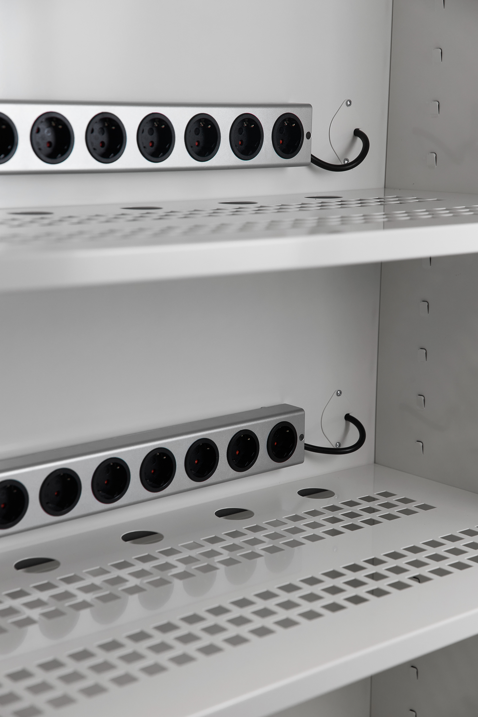 Additional 8-way power strip, mounted and ready above the shelf.