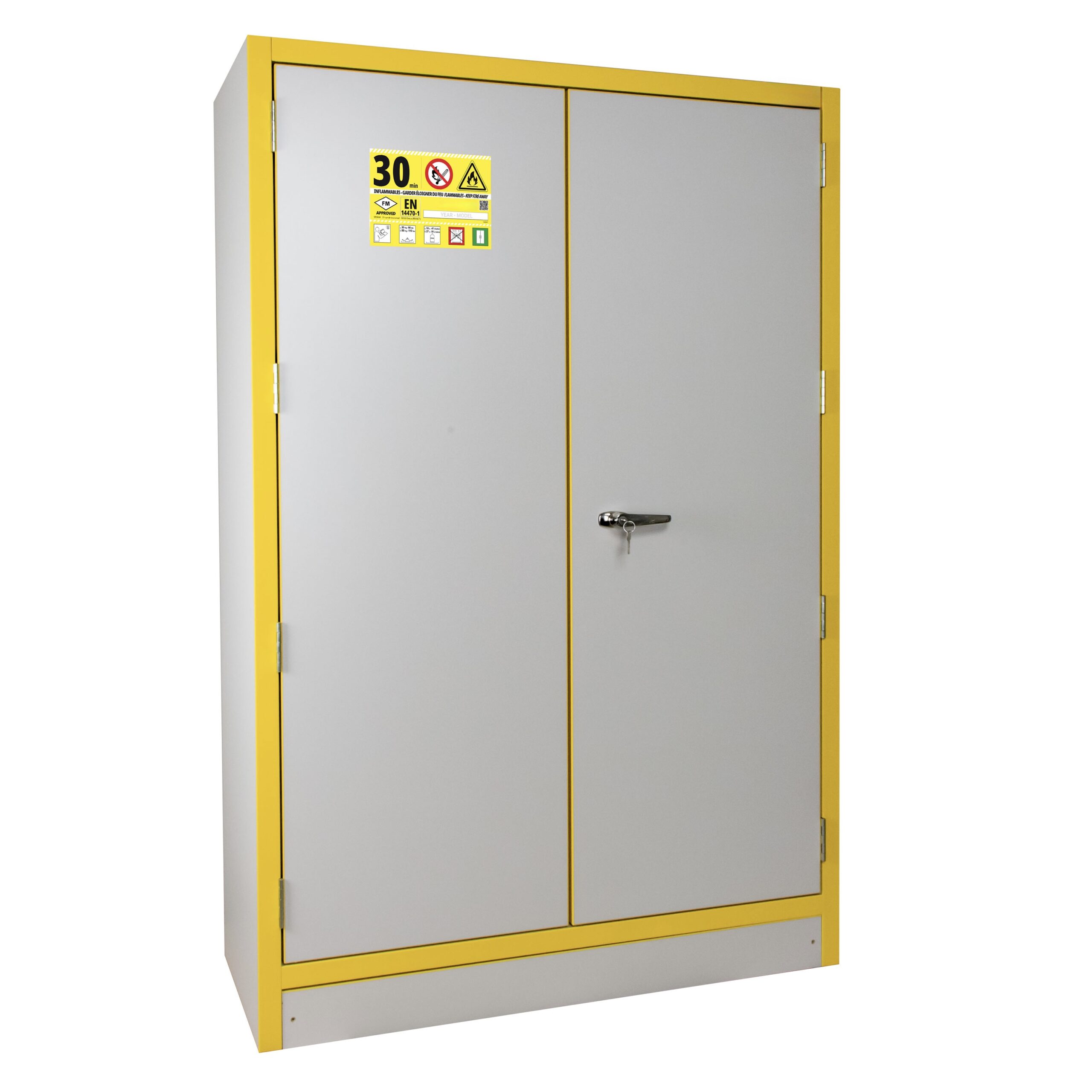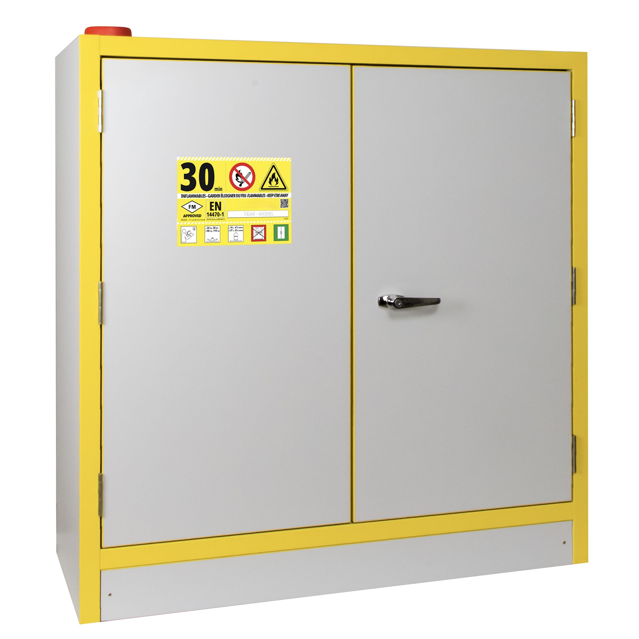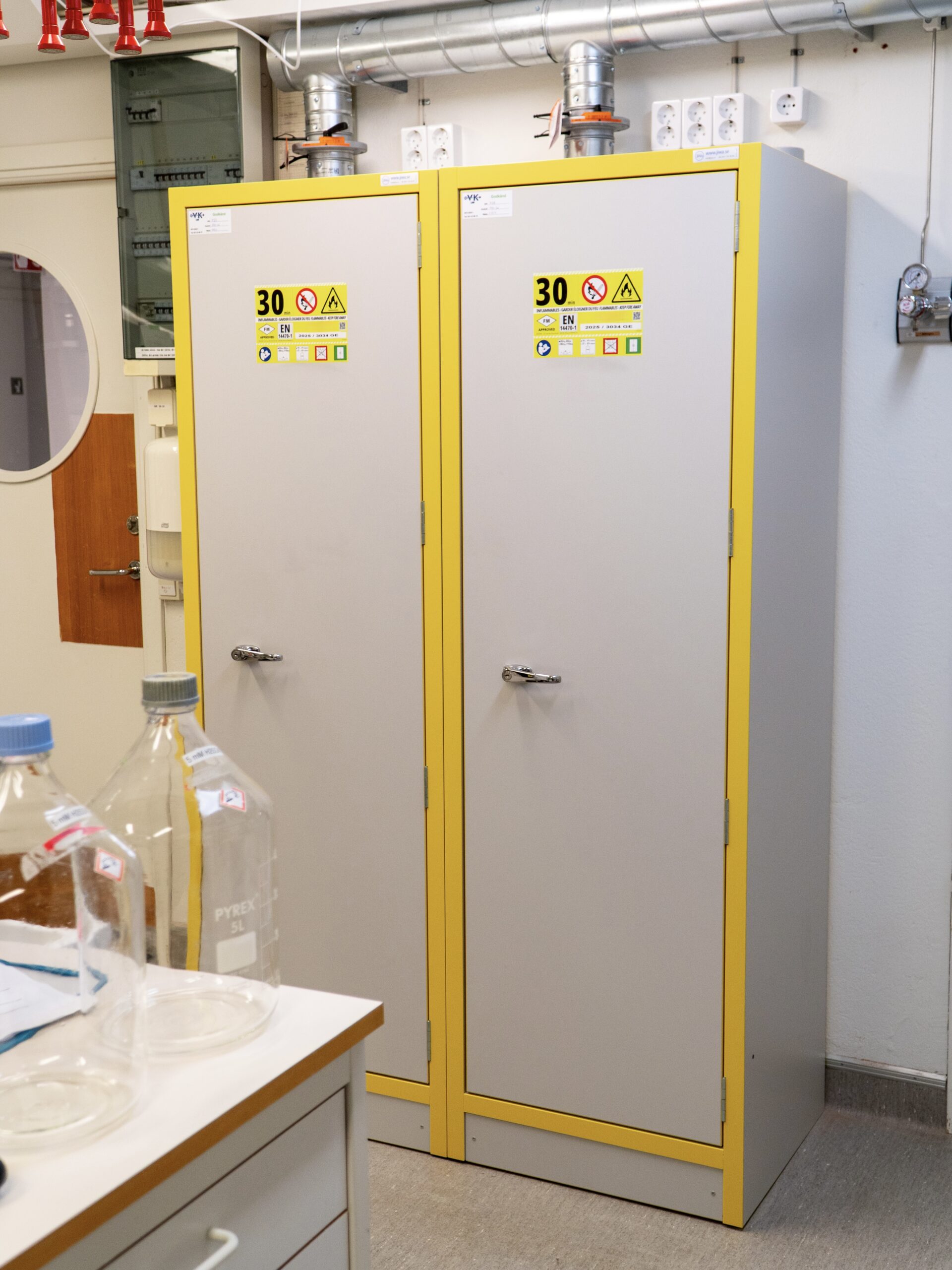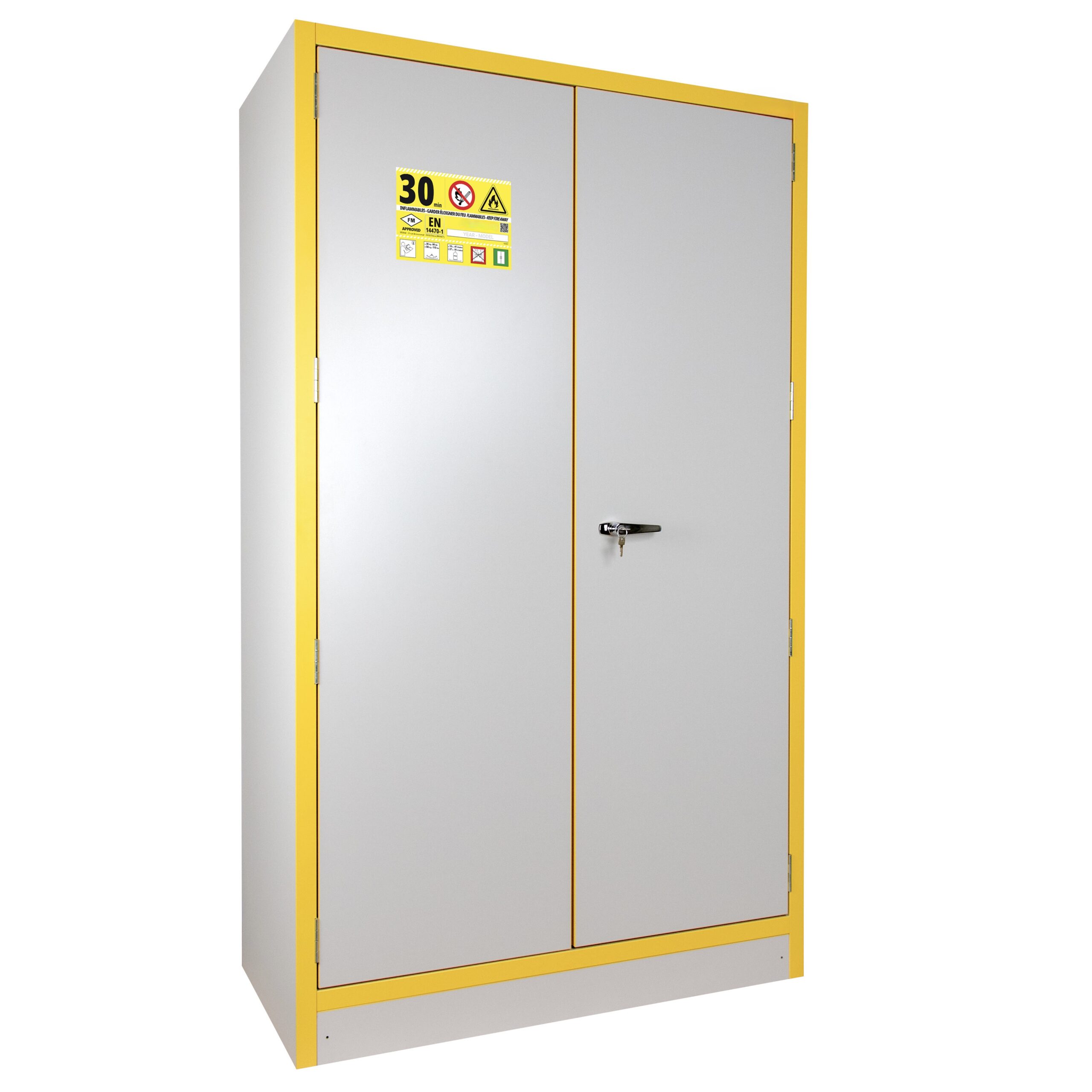 JiWas F30 Separating Chemical Cabinets are fire tested for 30 minutes in accordance with EN-standard 14470-1. The cabinets are fitted with self-closing dorrs that can be set in an open position but will close automatically when a temperature rise of 50°C occurs in the room. Doors are locked separately.
