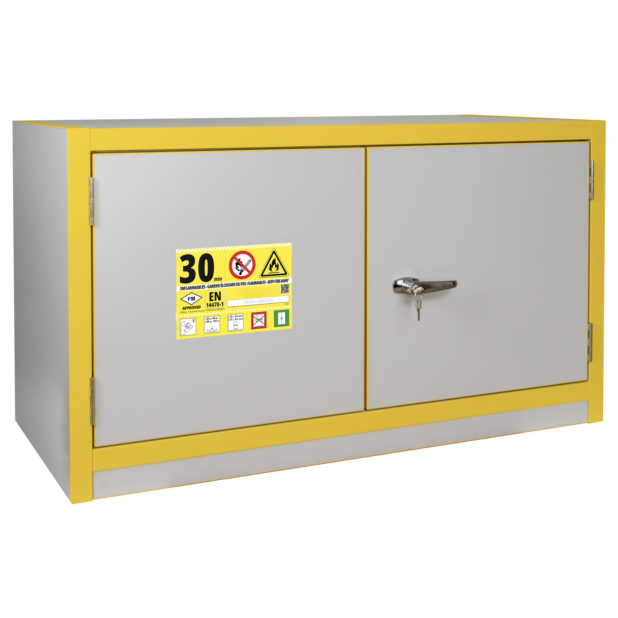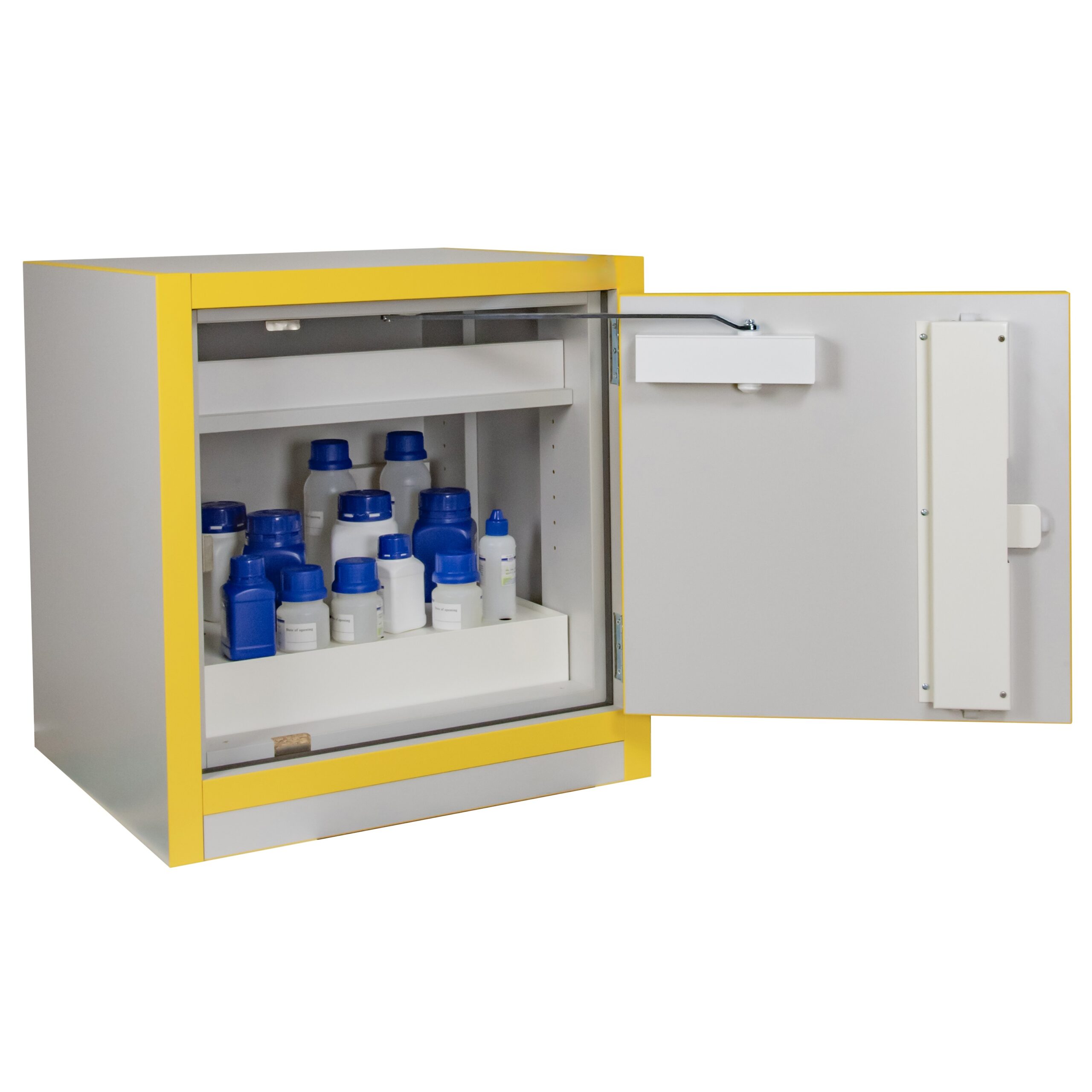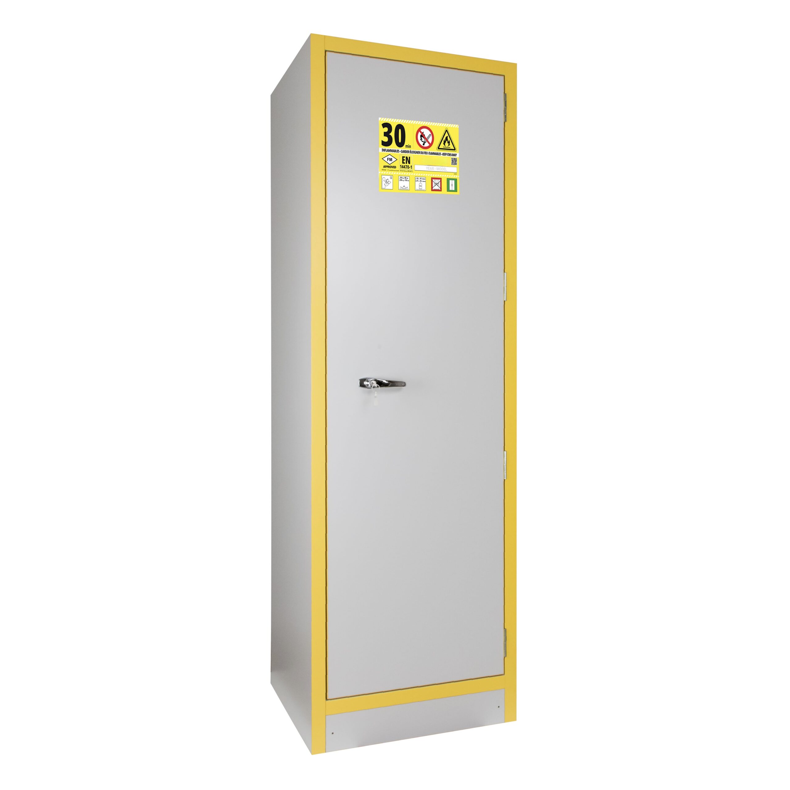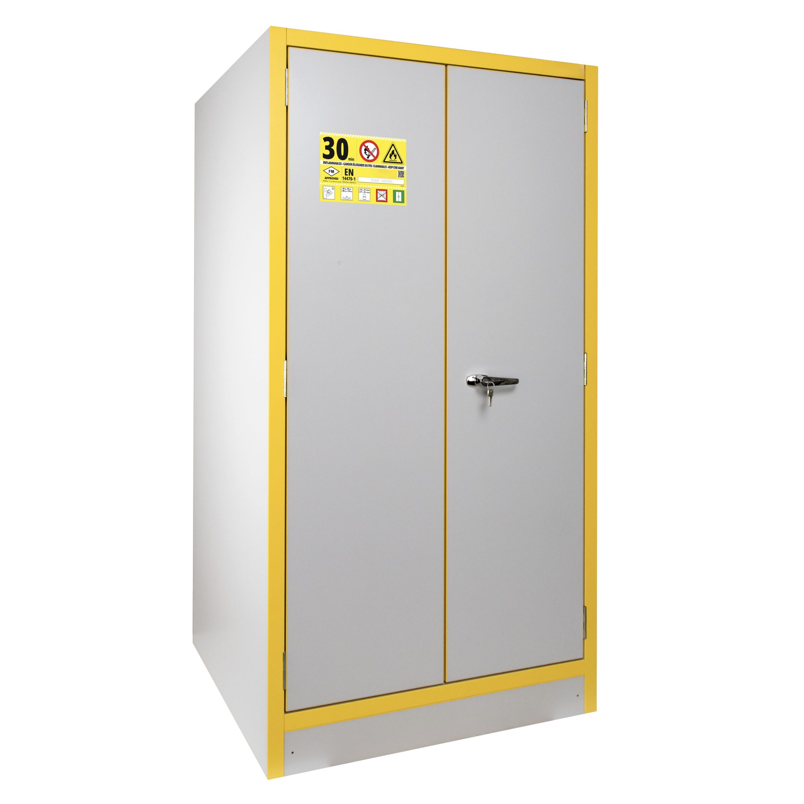 JiWas F30 Separating Chemical Cabinets are fire tested for 30 minutes in accordance with EN-standard 14470-1. The cabinets are fitted with self-closing dorrs that can be set in an open position but will close automatically when a temperature rise of 50°C occurs in the room. Doors are locked separately.