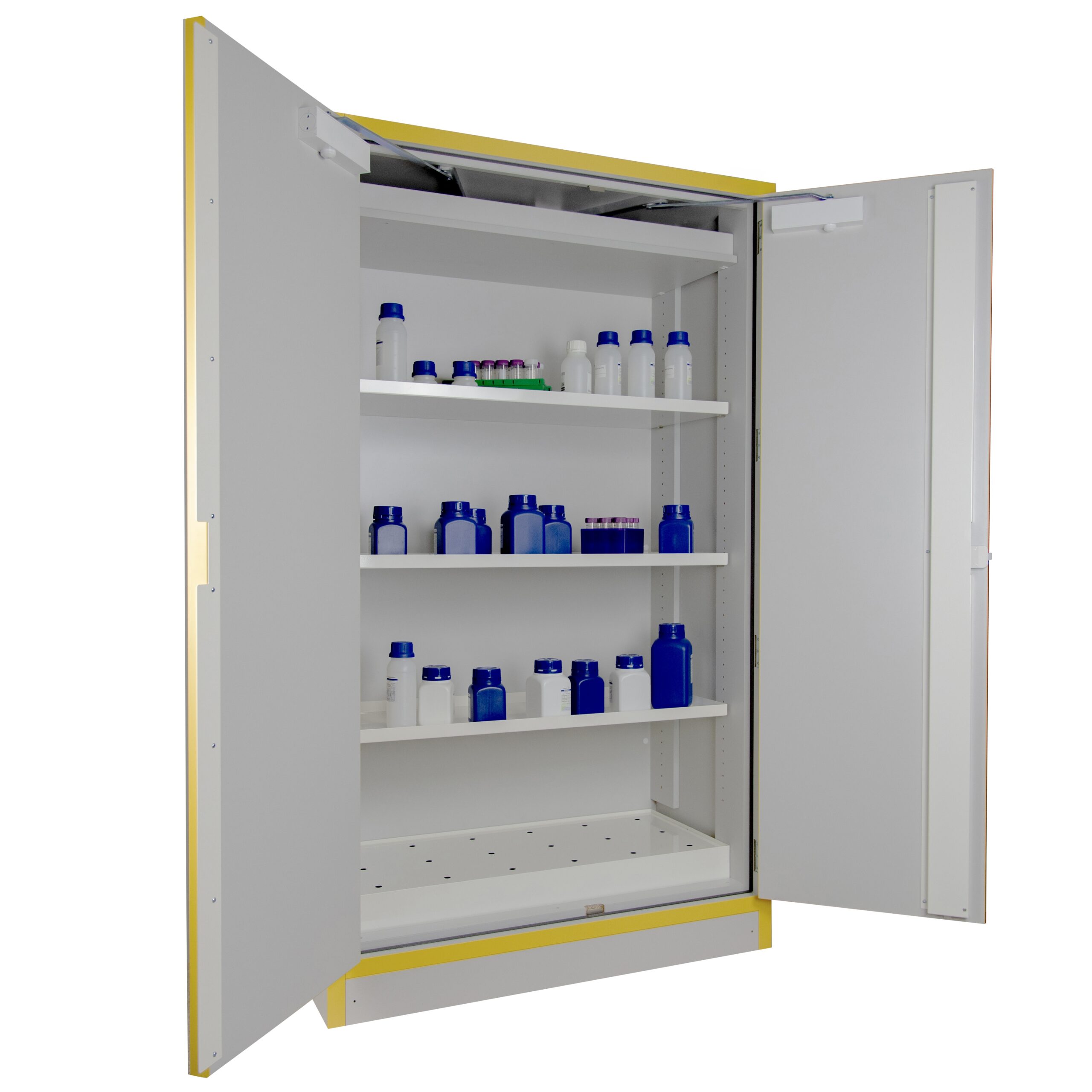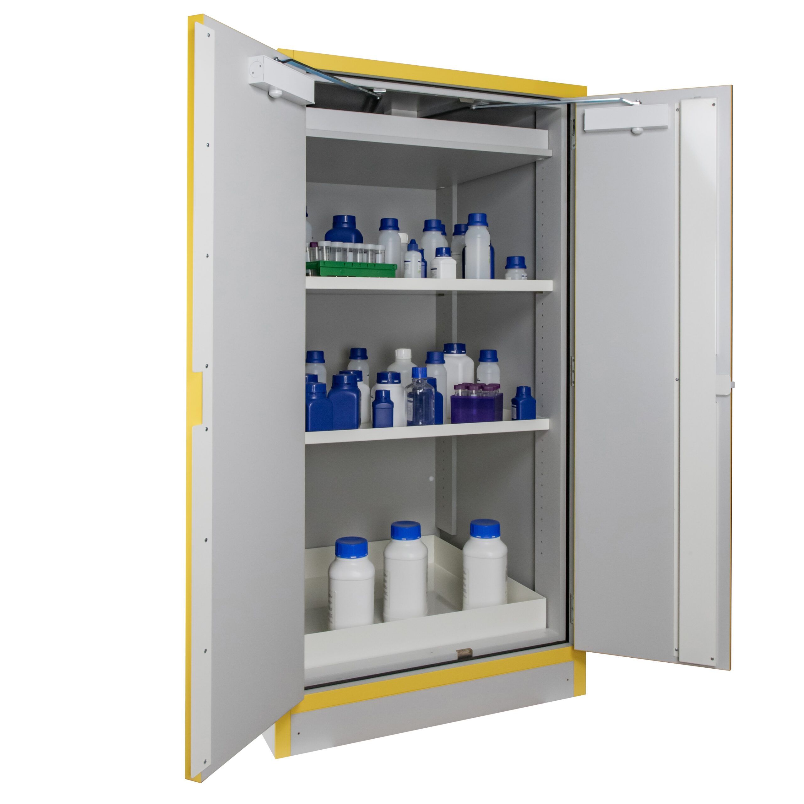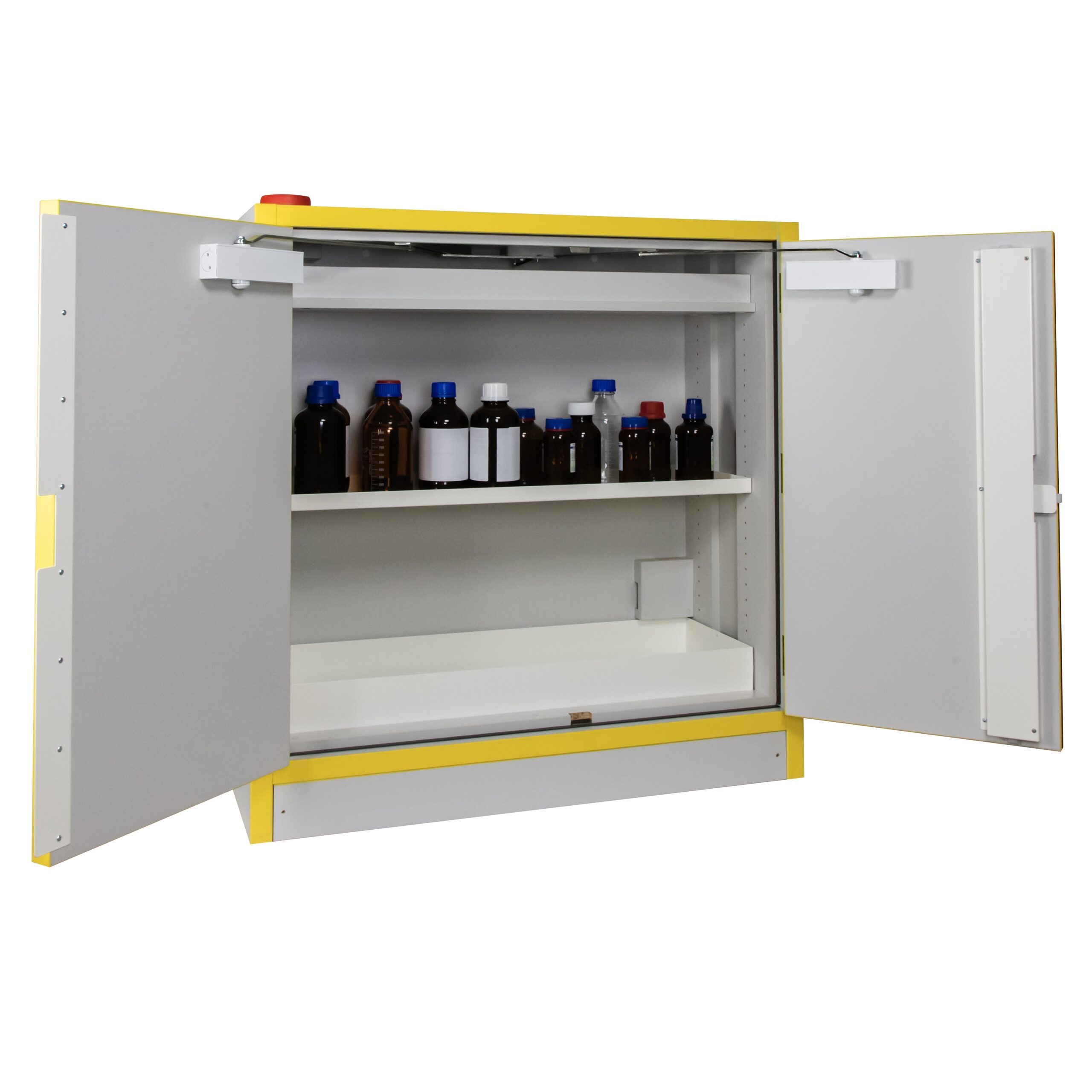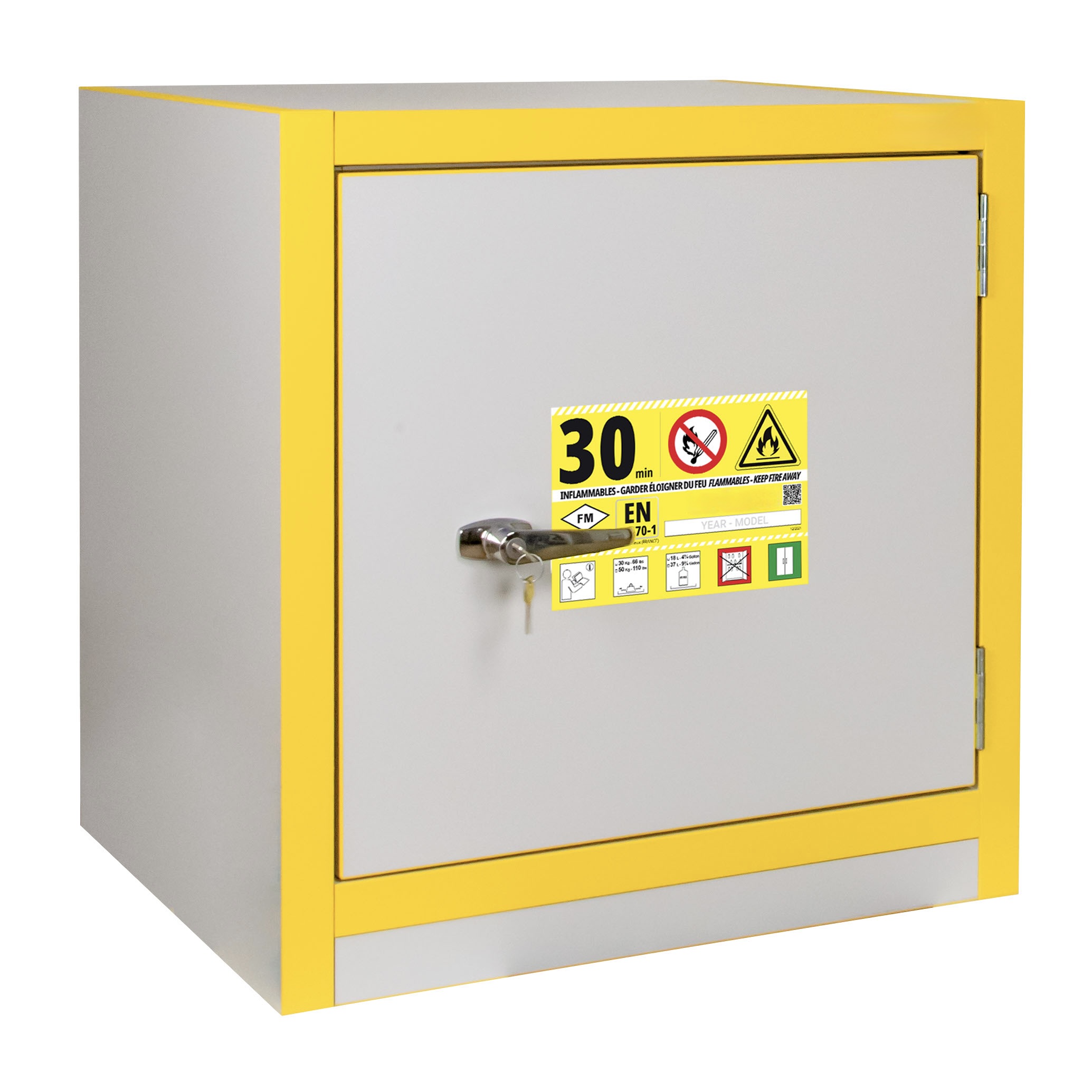 JiWas F30 Separating Chemical Cabinets are fire tested for 30 minutes in accordance with EN-standard 14470-1. The cabinets are fitted with self-closing dorrs that can be set in an open position but will close automatically when a temperature rise of 50°C occurs in the room. Doors are locked separately.
