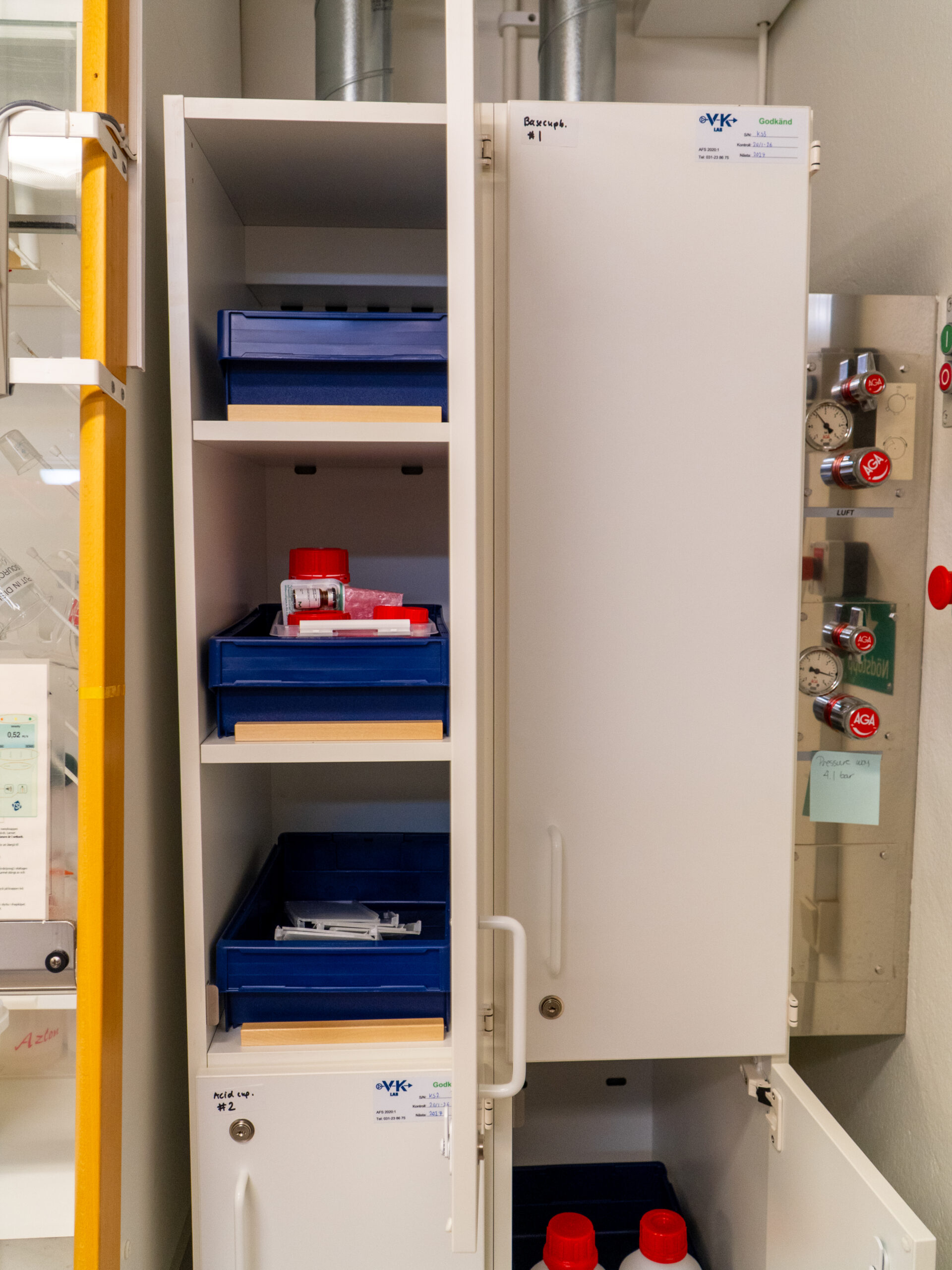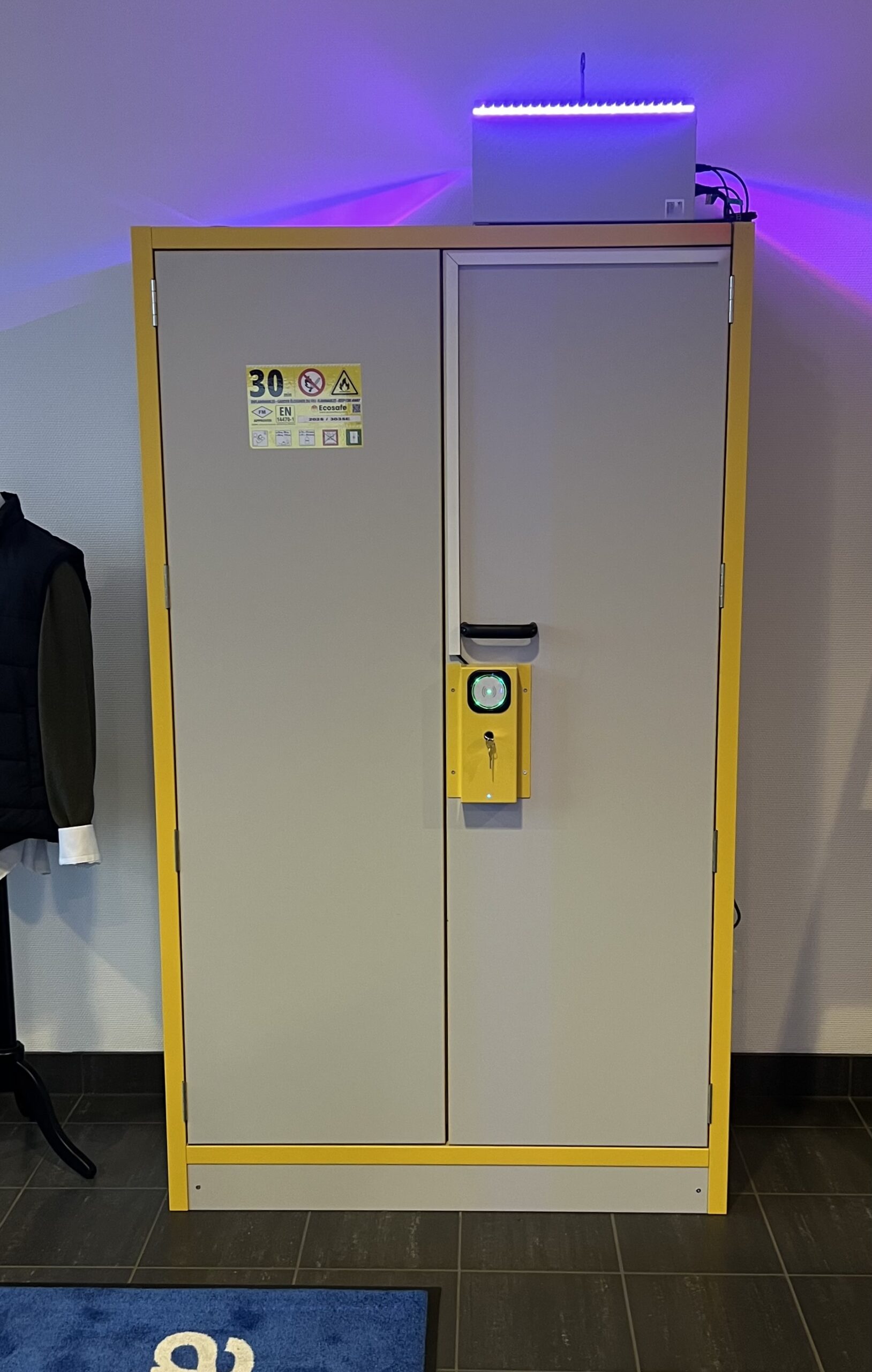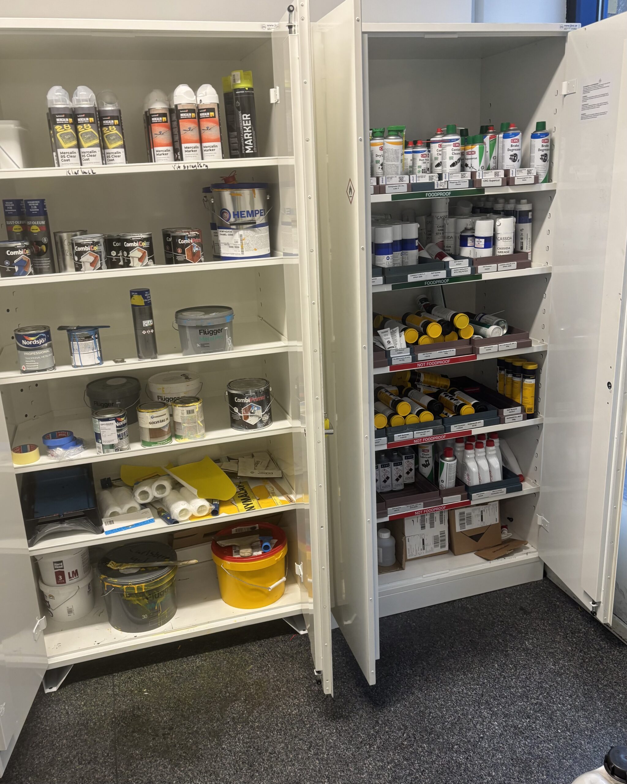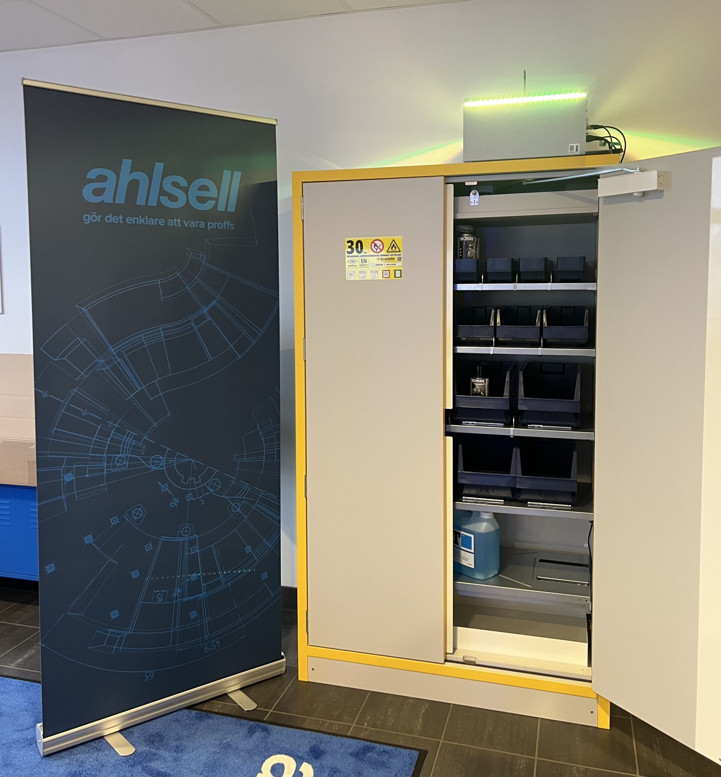 I detta projekt har ett brandklassat kemikalieskåp F30 levererats som en del av Ahlsells koncept för flexibla förrådslösningar.