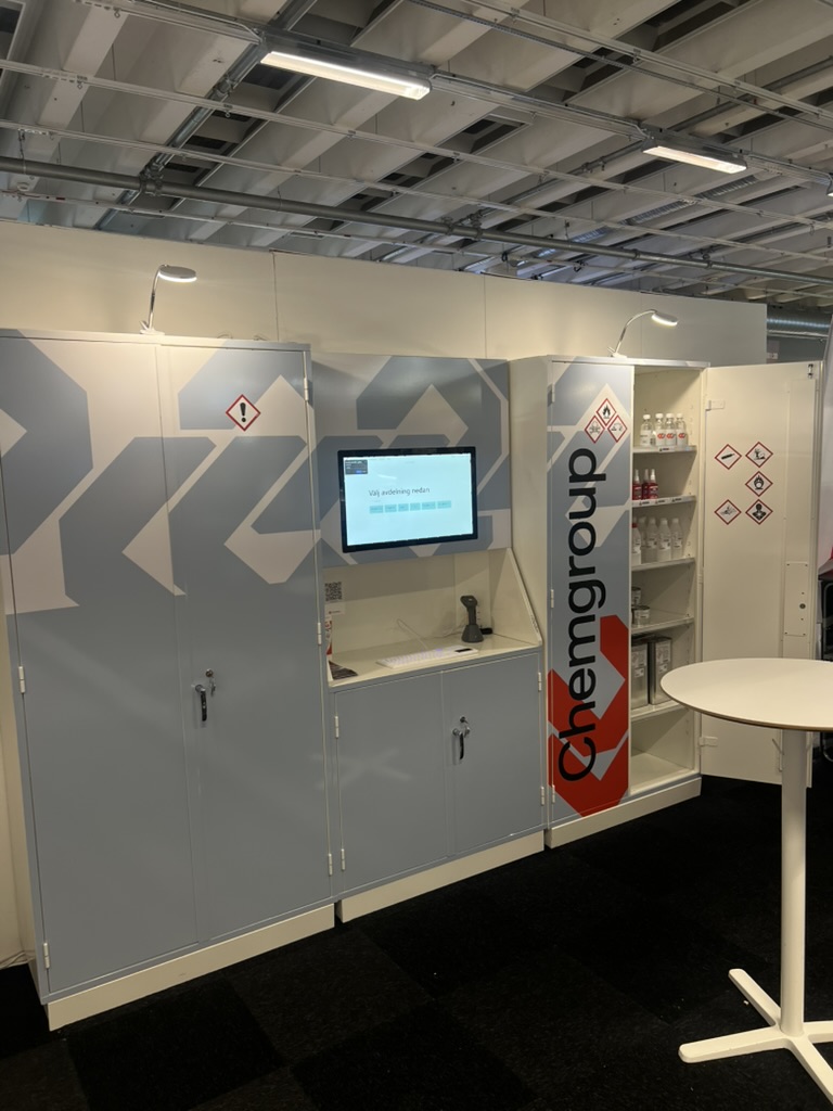 På bilden visas två Kemikalieskåp G2006B och ett Kemikalieskåp G806G samt en specialbyggd terminalhuv åt Chemgroups kemikaliehanteringsystem. Ventilationen från det lilla kemskåpet löper i bakkant och ut i toppen som för de stora kemskåpen.