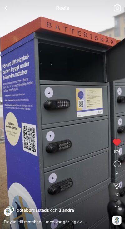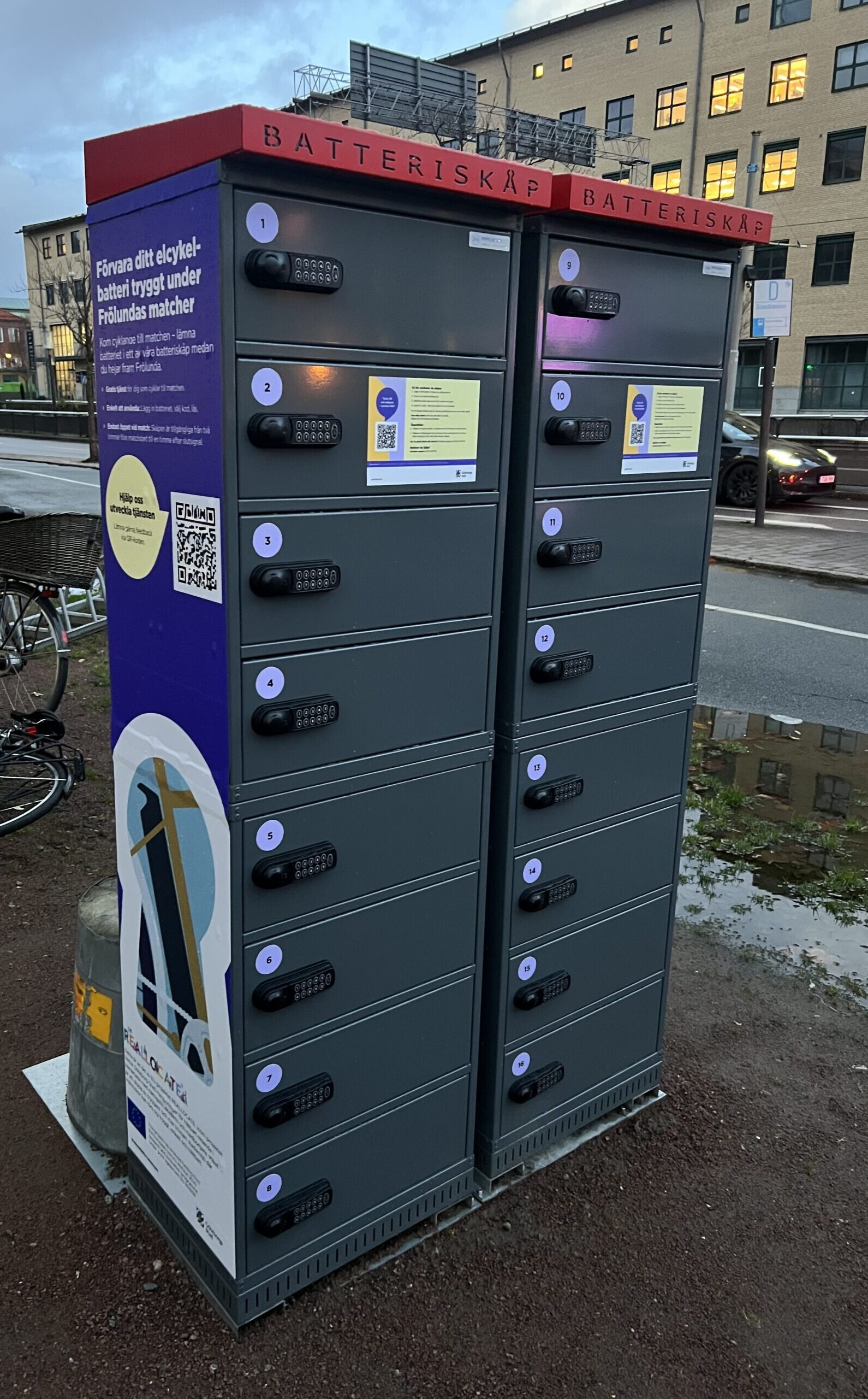 Gå gärna förbi Scandinavium och se hur elcykelbatterier kan förvaras säkert utomhus i batteriskåp.